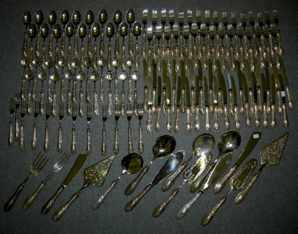 Firmato, datato. Set di posate per dolci con manici in argento composto da quattro spatole, quattro cucchiai da portata, quattro coltelli, due forchettoni, trentuno forchettine, trentuno coltellini, diciotto cucchiaini e diciotto cucchiai. Inizi XX secolo.