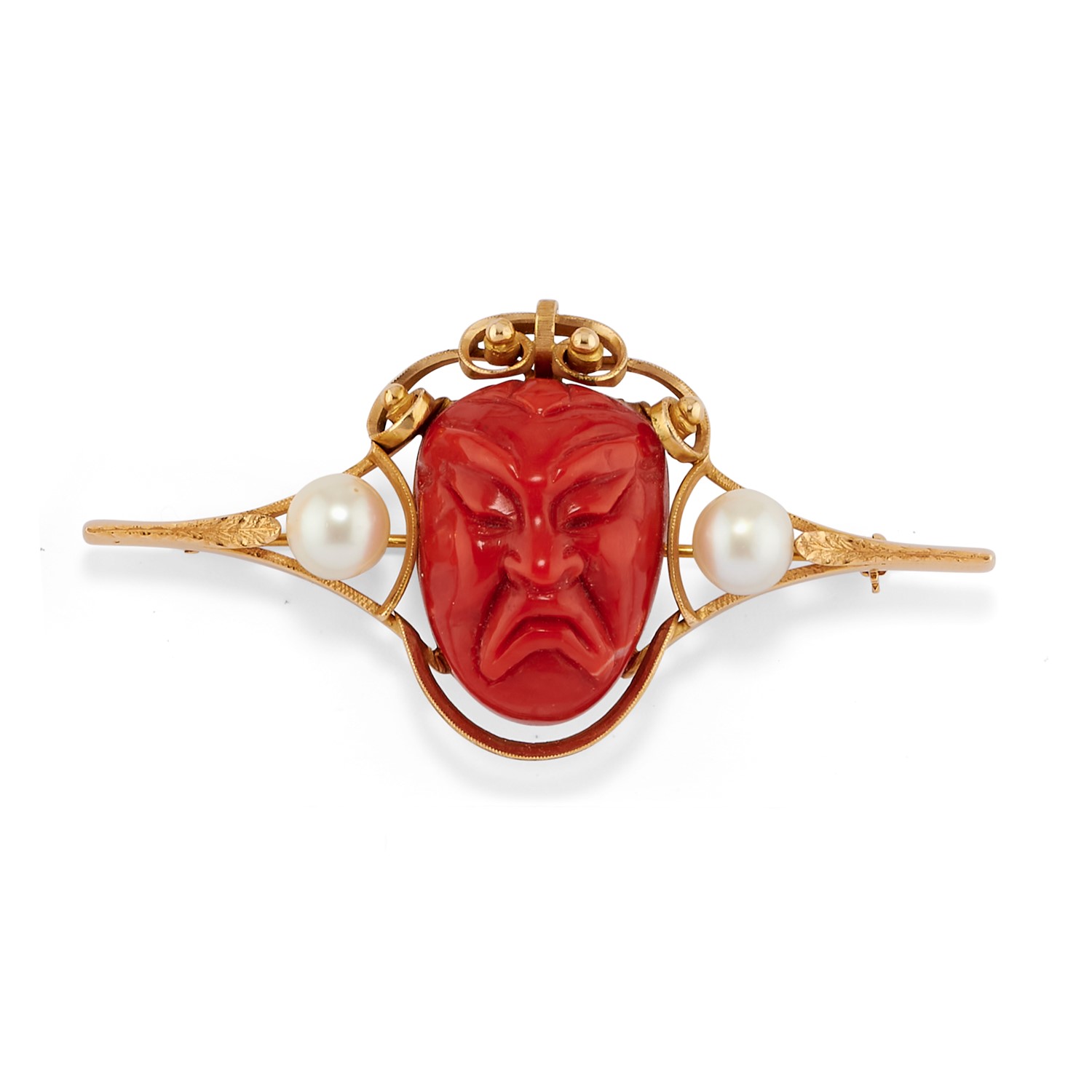 in oro giallo 18K, due perle coltivate di mm 8,00/8,50 circa e corallo scolpito a maschera.