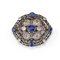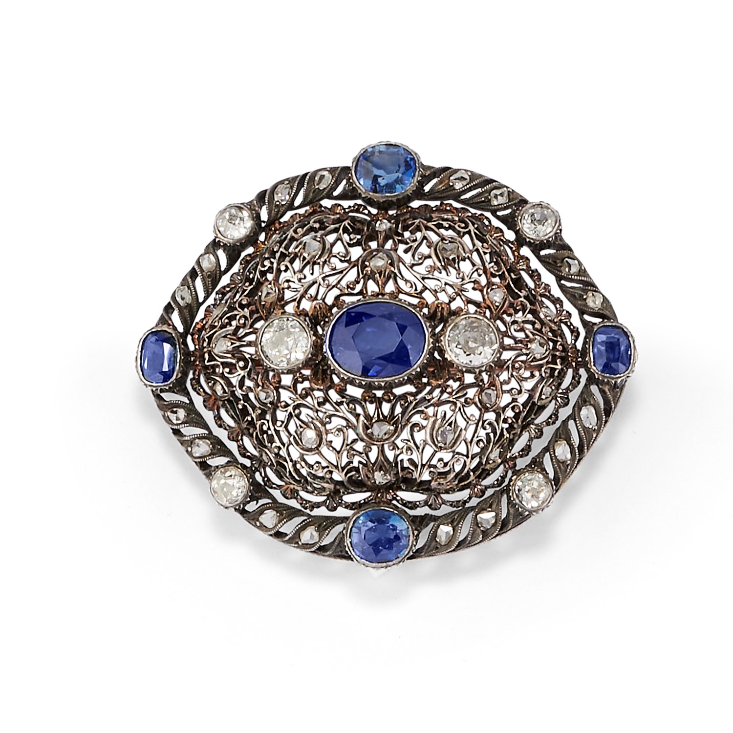 in argento, oro giallo 18K, decorata da zaffiri taglio ovale e diamanti taglio vecchio, di forma ovale.