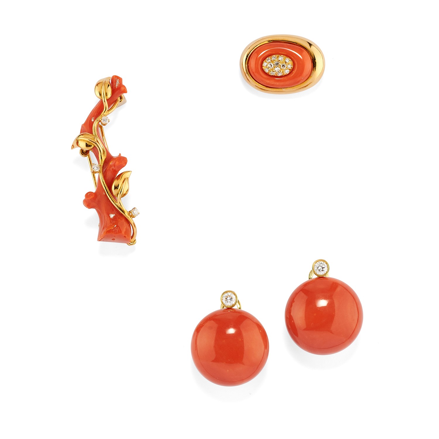 in oro giallo 18K, corallo di mm 25,50, diamanti taglio brillante per totale ct 0,70 circa, chiusura con perno e clip.