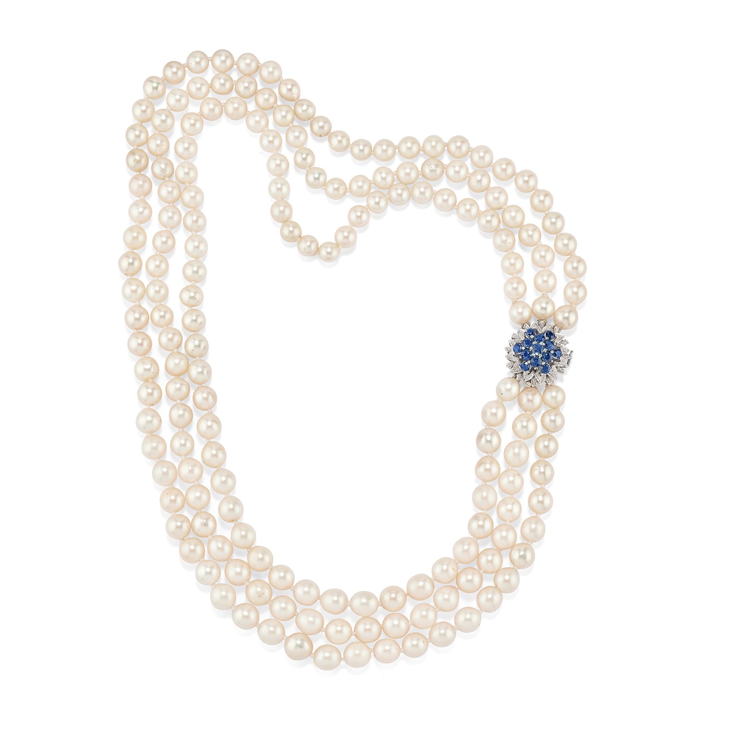 in oro bianco 18K, a tre fili di perle di coltivate di mm 7,50/9,50 e zaffiri taglio rotondo.