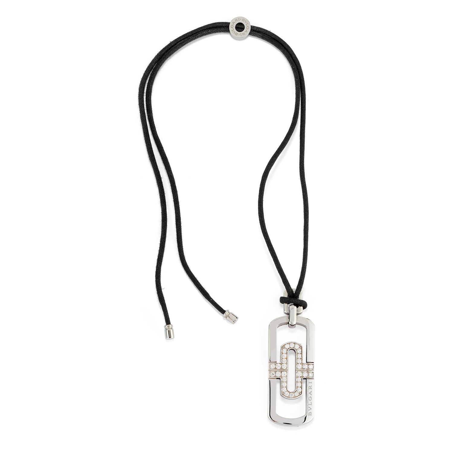 in acciaio e diamanti taglio brillante per totale ct 0,80 circa, trattenuto da cordoncino nero con chiusura scorrevole, collezione "Parentesi".