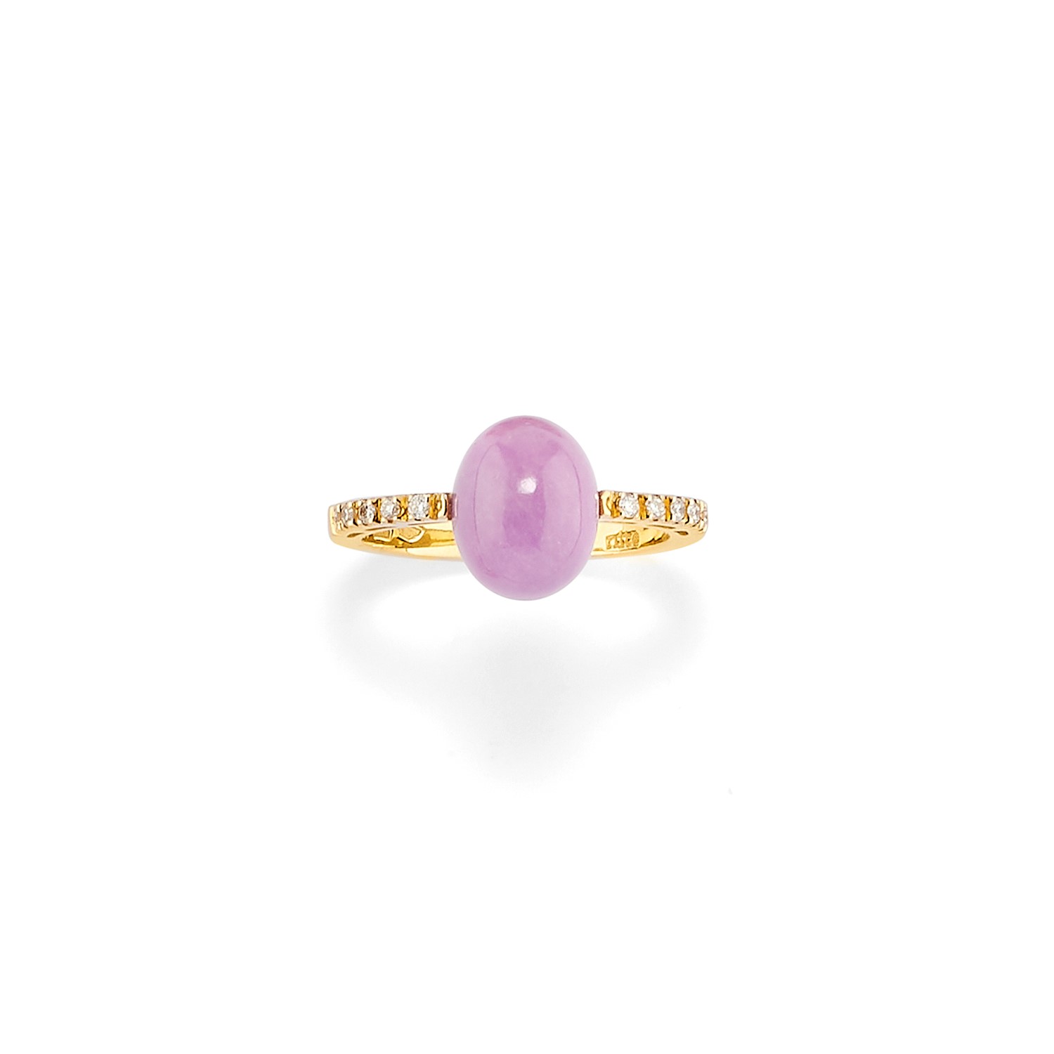 in giallo 18K, pietra viola taglio ovale cabochon e diamanti taglio brillante per totale ct 0,10 circa.