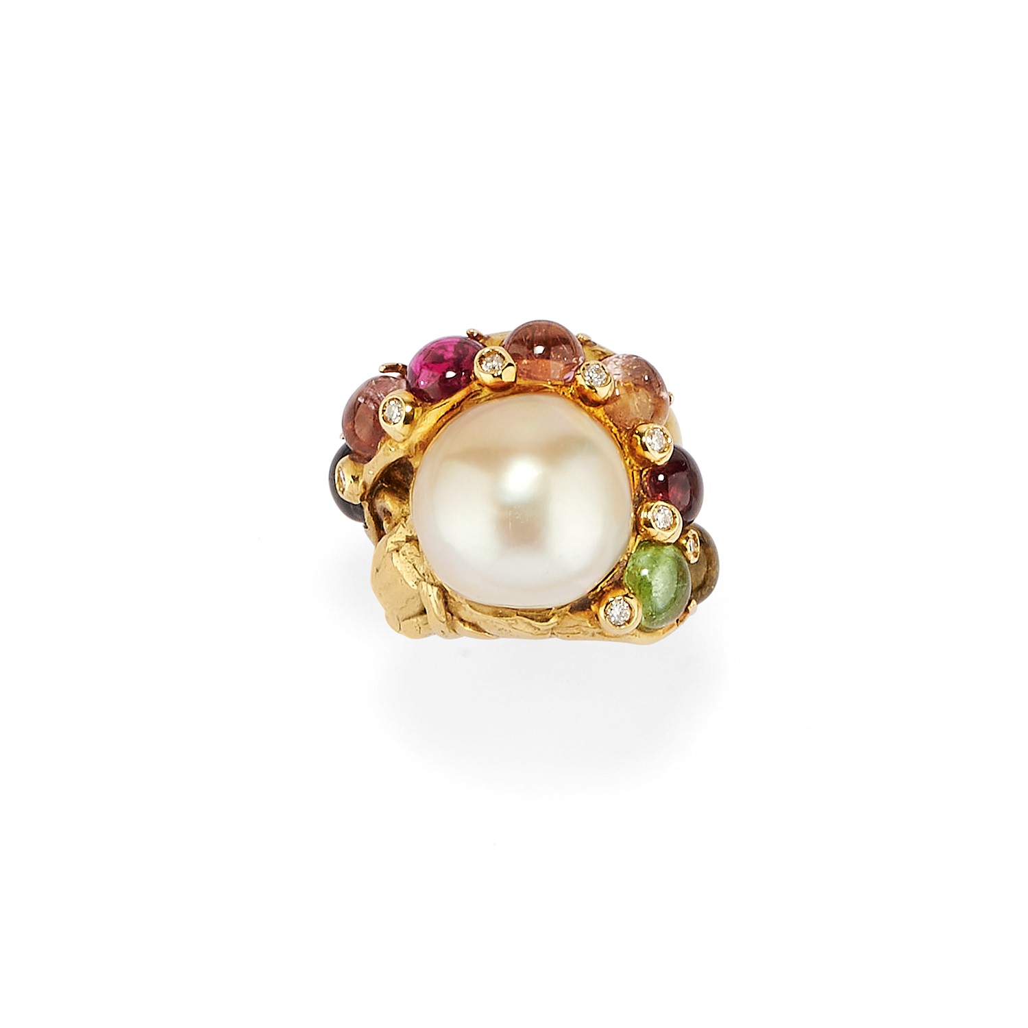 in oro giallo 18K, perla barocca di mm 14,50 circa, diamanti e pietre semipreziose taglio cabochon.