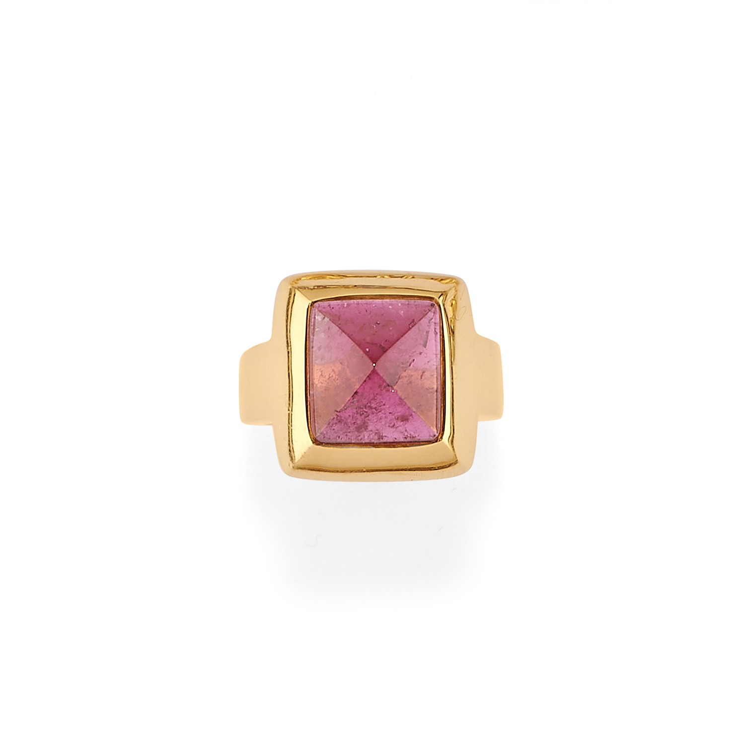in oro giallo 18K e tormalina rosa taglio quadrato.