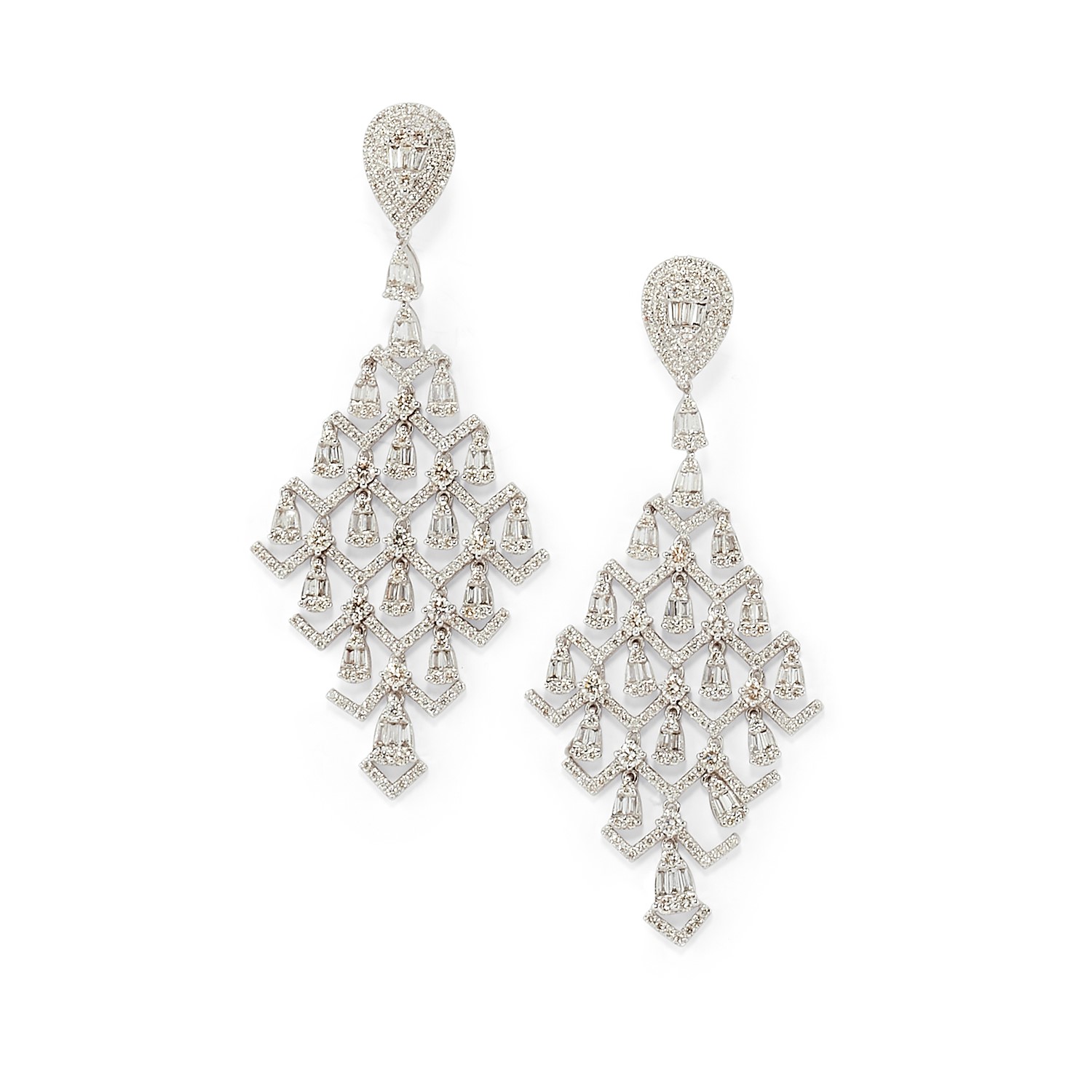 in oro bianco 18K, diamanti taglio brillante e baguette per totale ct 3,70 circa, motivo a chandelier, chiusura con perno e farfalla.