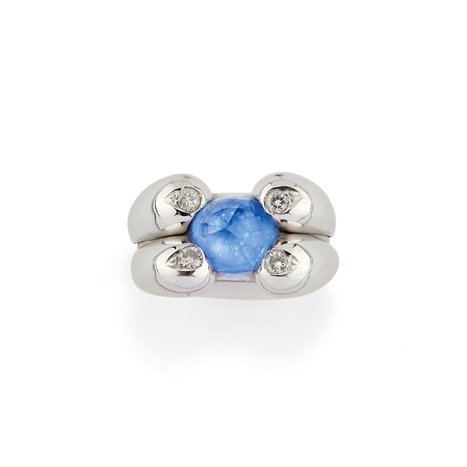 in oro bianco 18K, zaffiro taglio ovale di ct 3,00 circa, incassato alla rovescia, dettagli in diamanti taglio brillante per totale ct 0,20 circa.