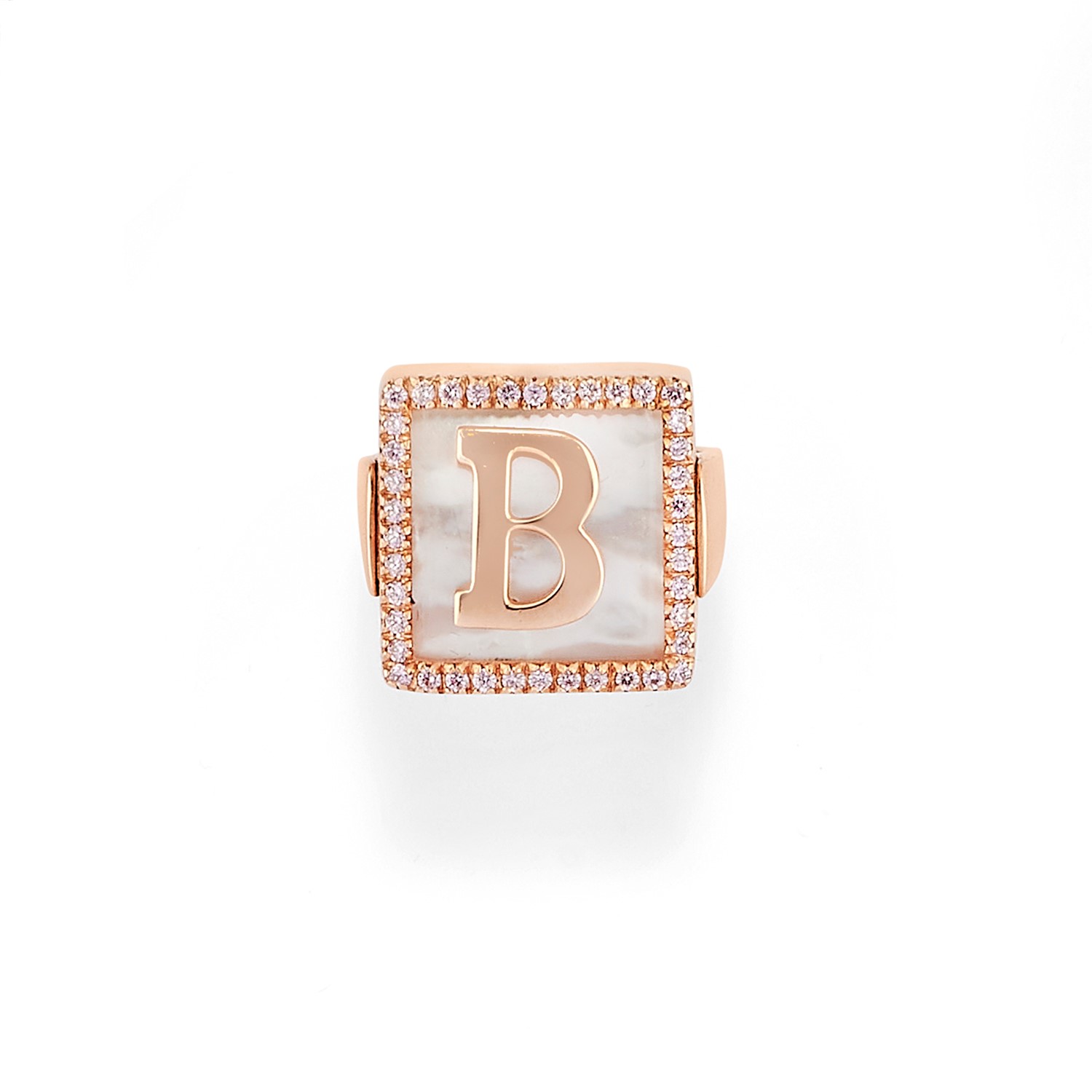 in oro rosso 18K, di forma quadrata con madreperla, lettera "B" e contorno con pietre rosa.