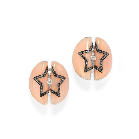 in oro bianco 18K, con motivo a stella in diamanti neri e incolori taglio brillante totale ct 0,70 circa e pietra dura color salmone, chiusura con perno a clip.