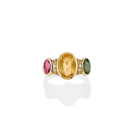 in oro giallo 18K, diamanti taglio huit-huit e brillante, zaffiri rosa, giallo e verde taglio ovale per totale ct 3,00 circa.