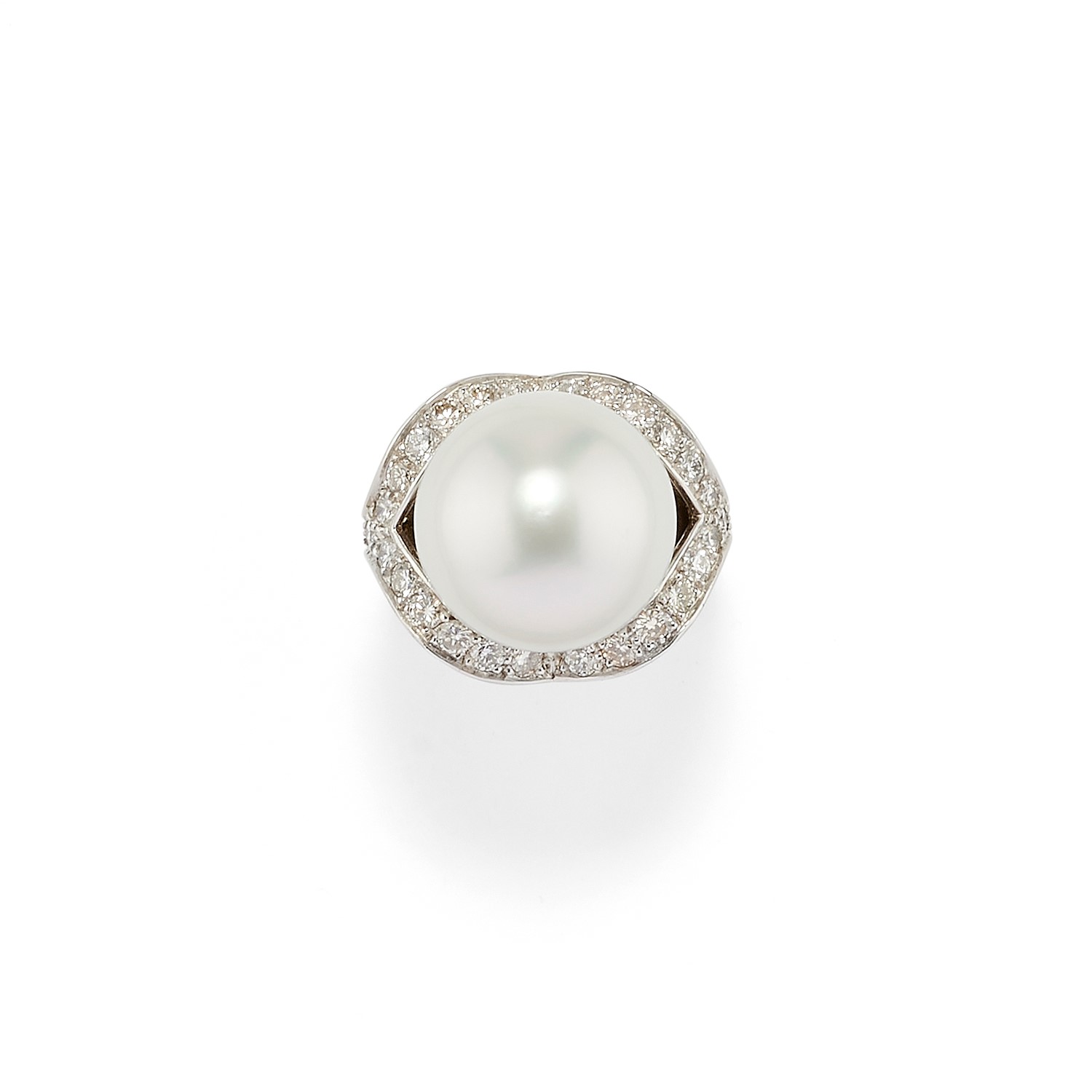 in oro bianco 18K, al centro perla coltivata Australiana color argento di mm 16,50 circa e diamanti taglio brillante per totale ct 2,50 circa.