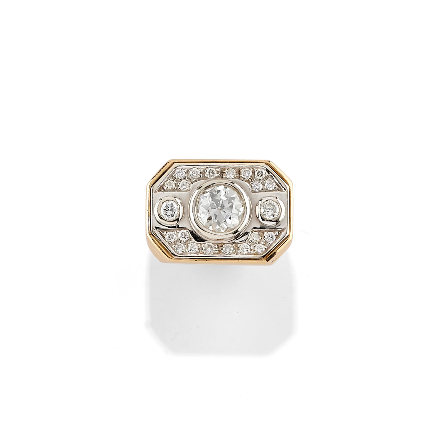 in oro bicolore 18K, al centro diamante taglio vecchio di ct 2,50 circa, prob. colore K, purezza SI, contorno in diamanti taglio brillante per totale ct 0,60 circa.