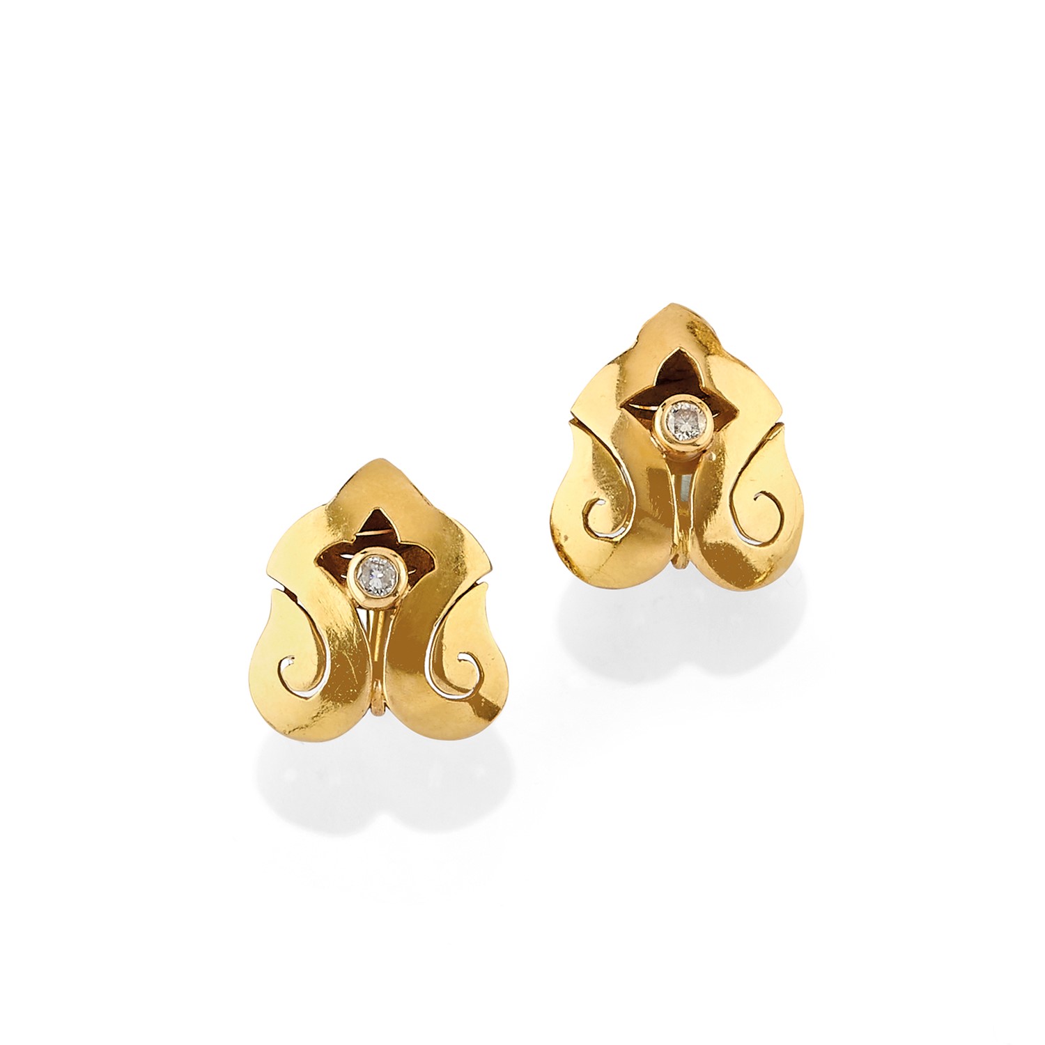 in oro giallo 18K e diamanti taglio brillante per totale ct 0,20 circa, realizzati a scudo.
