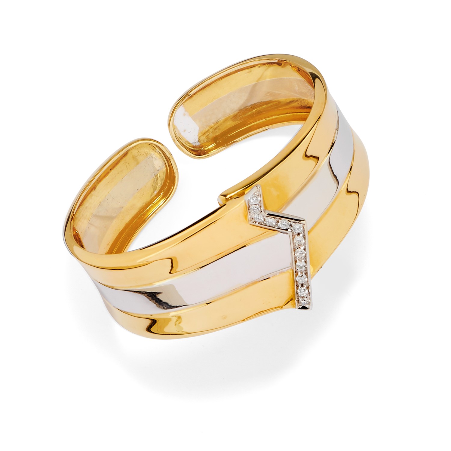 in oro bicolore 18K e diamanti per totale ct 0,60 circa, alla schiava con apertura a scatto.