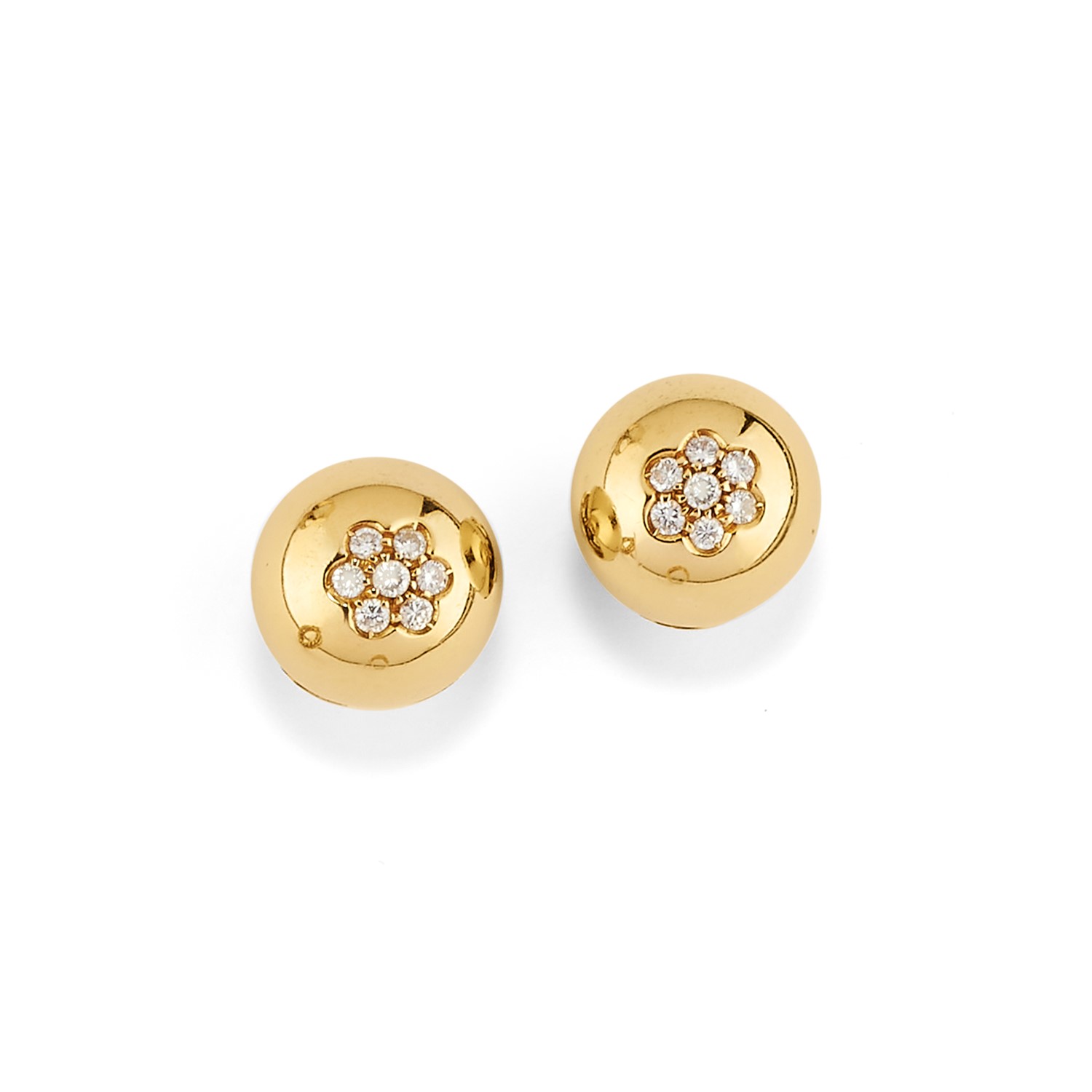 in oro giallo 18K, con motivo a fiore in diamanti taglio brillante, chiusura a scatto con perno.