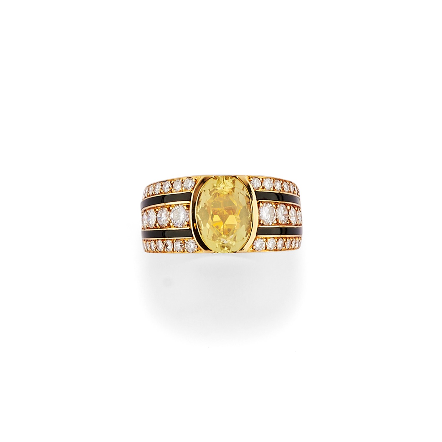 in oro giallo 18K, topazio taglio ovale di ct 3,00 circa, smalto nero e motivi lineari in diamanti taglio brillante per totale ct 1,10 circa, a fascia, con astuccio.