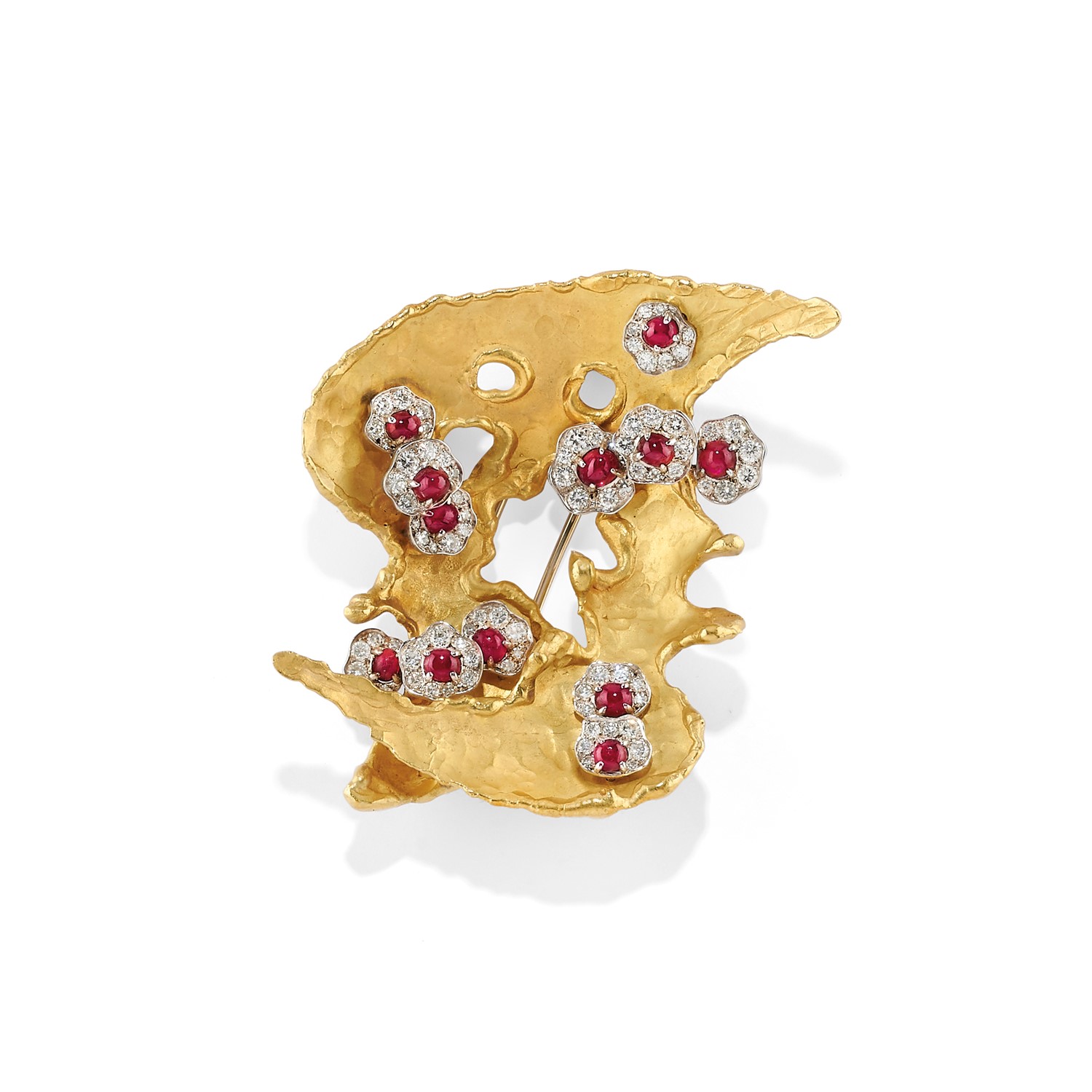 in oro bicolore 18K, diamanti taglio brillante e rubini taglio ovale cabochon, di forma stilizzata con motivi a fiore applicati.
