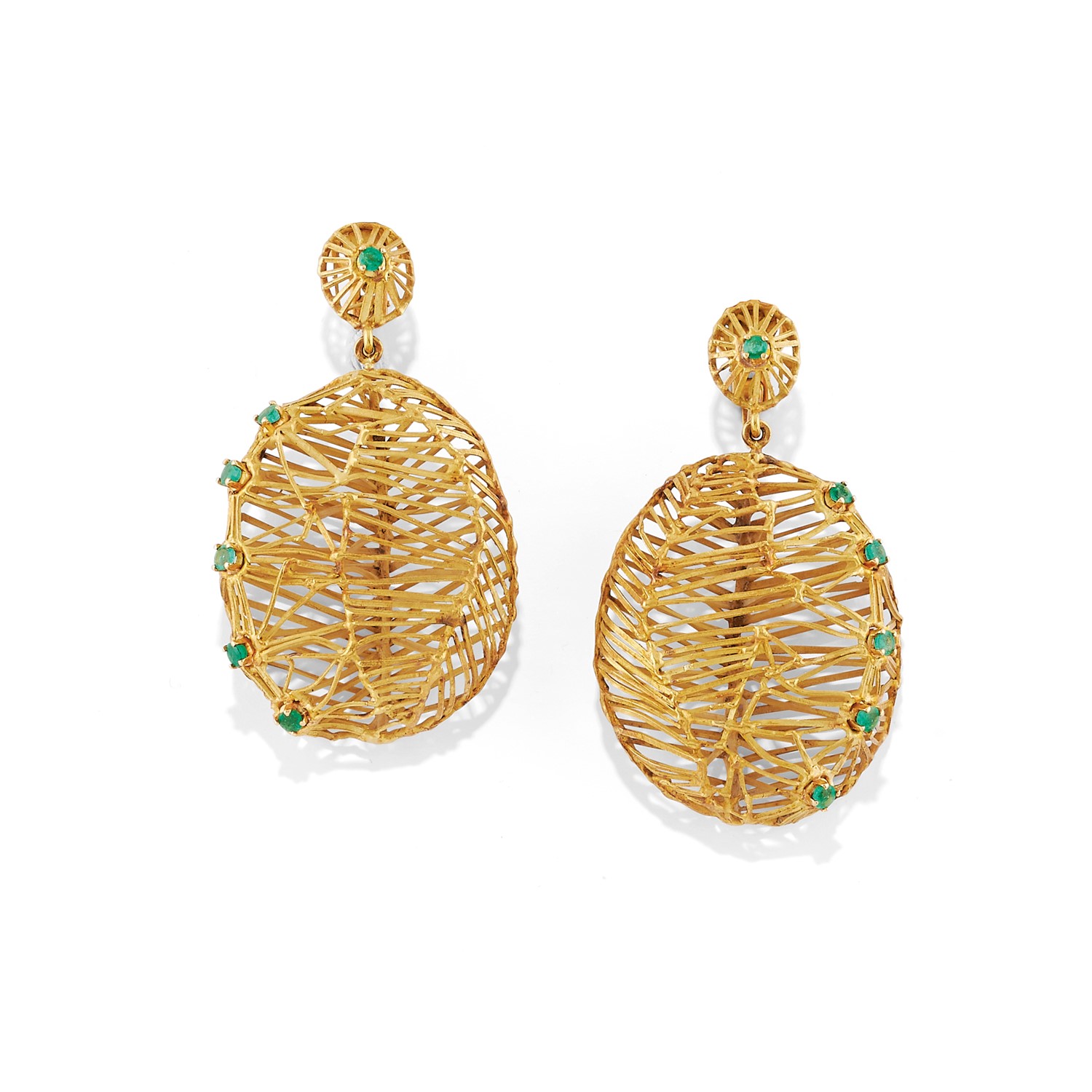 in oro giallo 18K e smeraldi taglio rotondo per totale ct 1,50 circa, di forma stilizzata con decoro a fili.