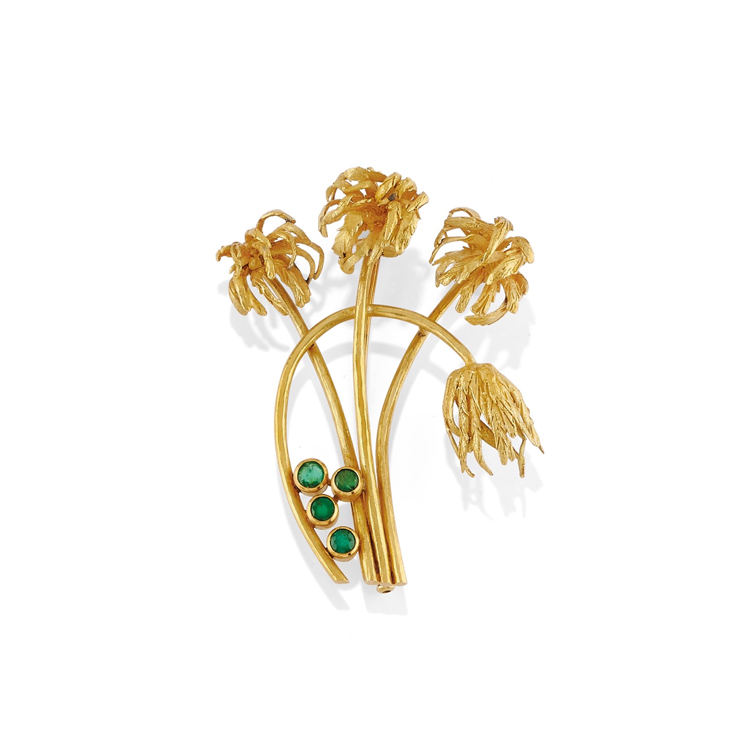 in oro giallo 18K e smeraldi taglio rotondo, realizzata a palme.