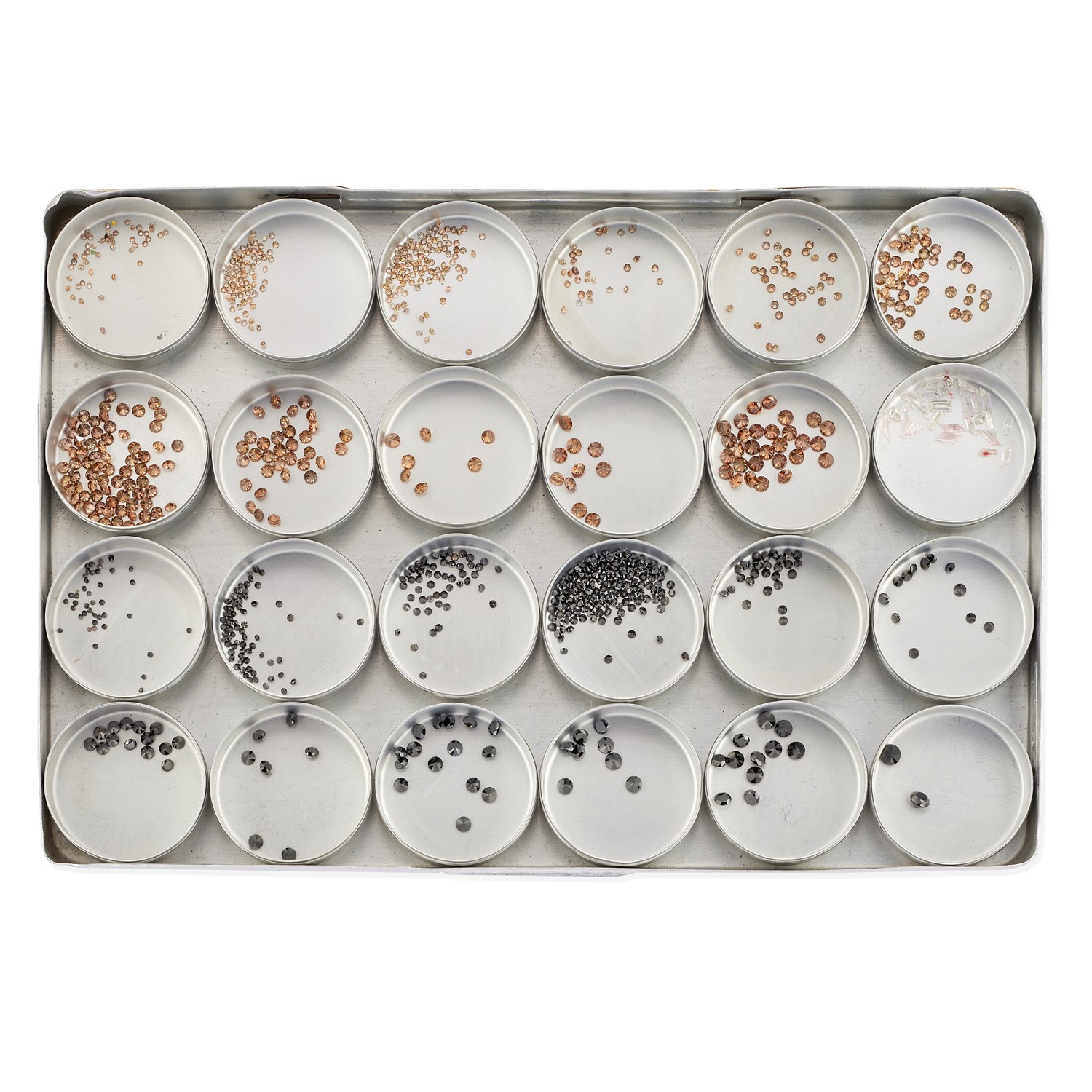 taglio brillante e fantasia per totale ct 32,95; suddivisi in ventiquattro scatolette: diamanti brown taglio brillante ct 17,15, diamanti neri taglio brillante ct 13,16, diamanti incolori taglio fantasia ct 2,64.