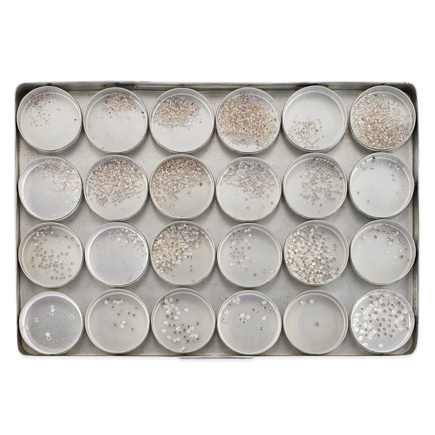 taglio brillante per totale ct 49,09, suddivisi in ventiquattro scatolette: setacci da 0,00 a 2, ct 13,52 (media ct 0,01) setacci da 2,5 a 6,5, ct 19,09 (media ct 0,02) setacci da 7 a 11, ct 16,53 (media da ct 0,03 a ct 0,07).