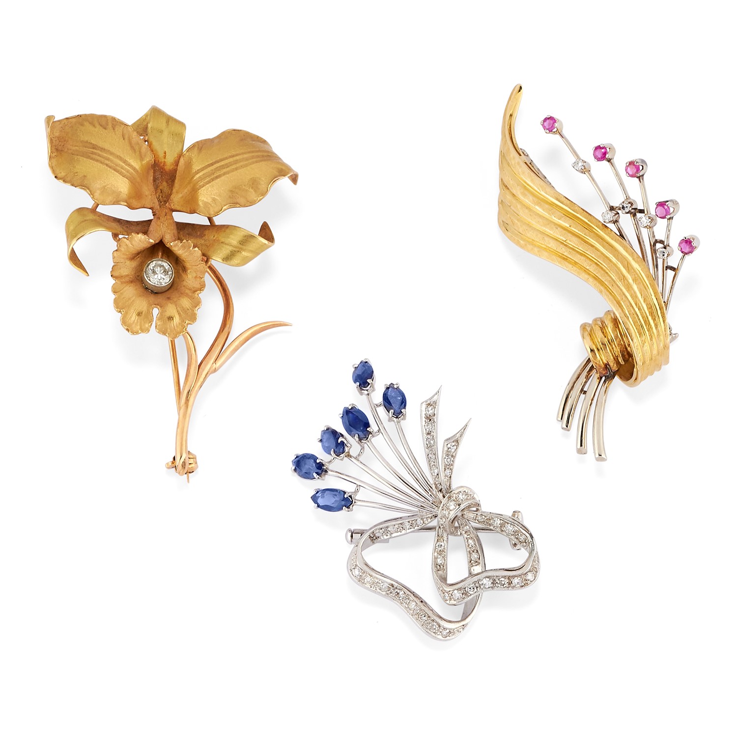 Tre spille con diamanti, rubini e zaffiri