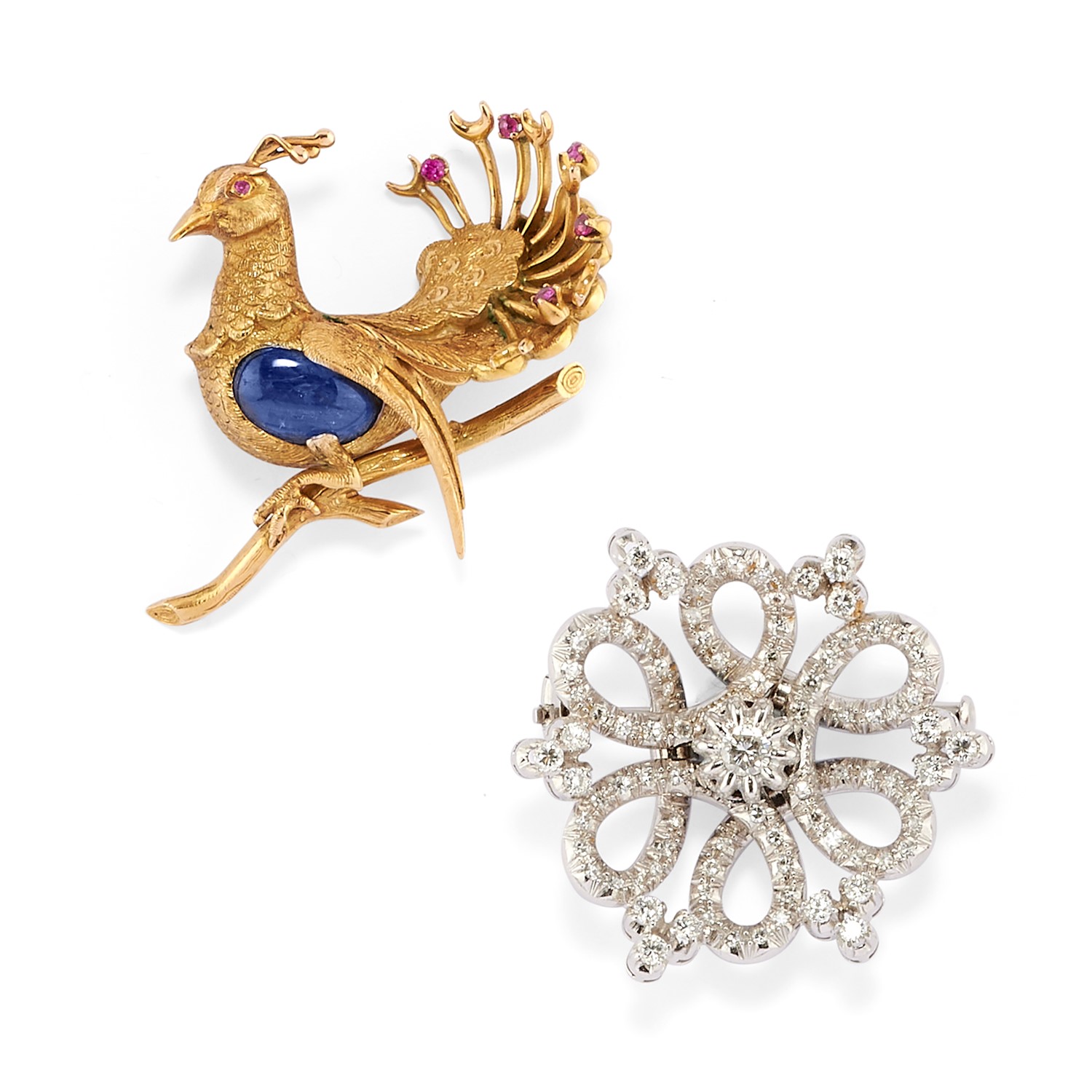in oro bicolore 18K, una a rosone con pavé di diamanti taglio brillante e huit huit per totale ct 1,30 circa, l'altra animalier con zaffiro taglio ovale cabochon e rubini raffigurante pavone.