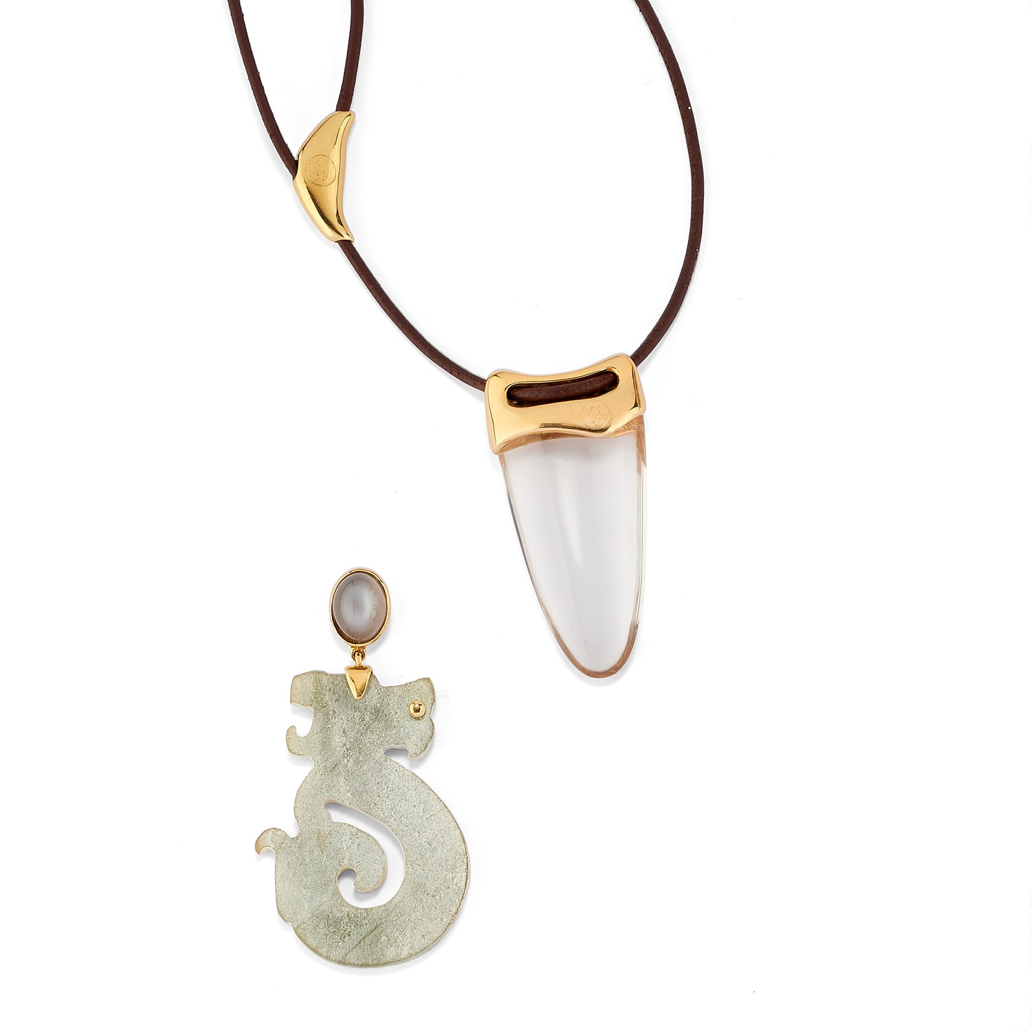 in oro giallo 18K, cristallo di rocca e cordoncino scorrevole firmato RG (Rinaldo Gavello), pendente con pietra di luna taglio ovale cabochon raffigurante dragone.
