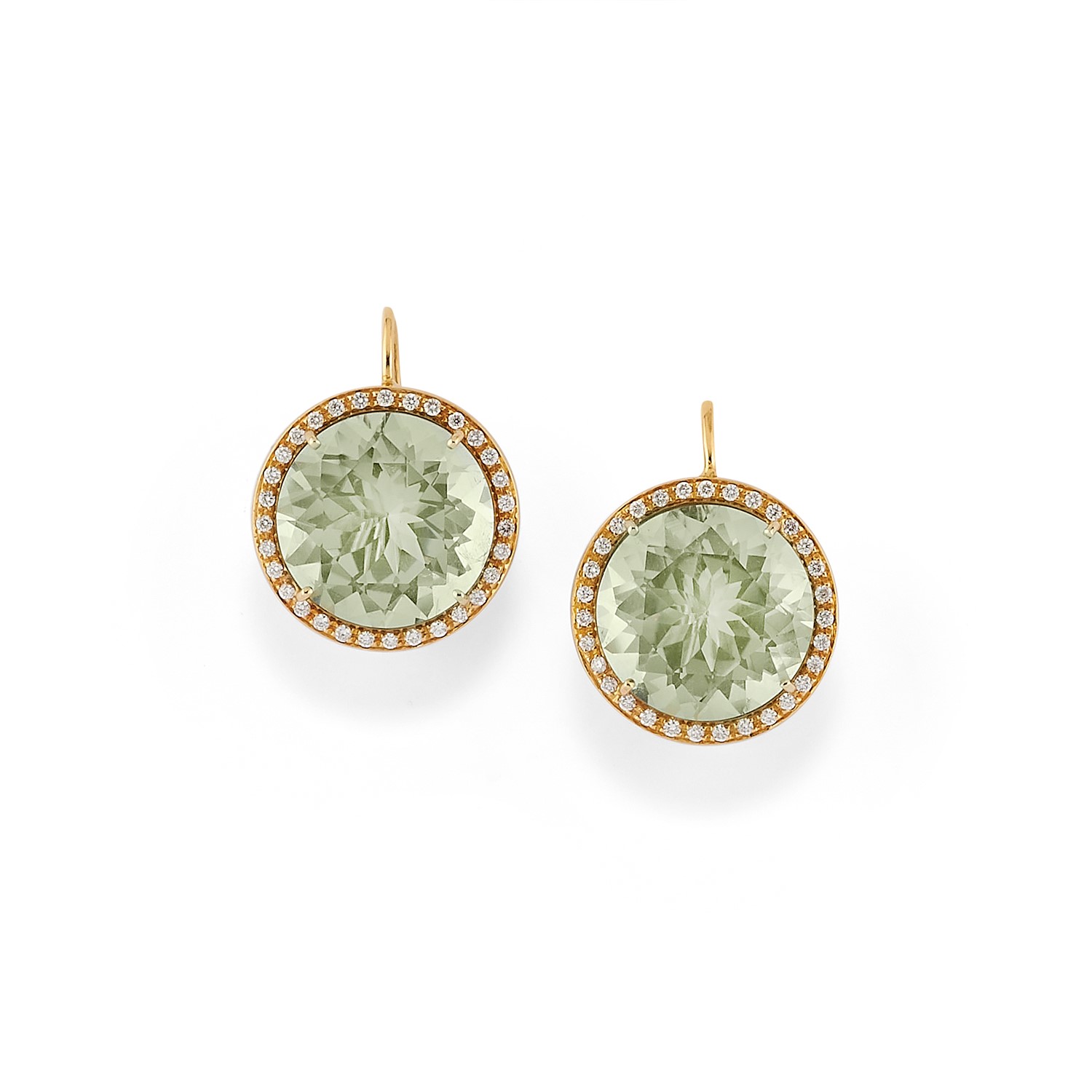in oro giallo 18K, con ametista verde taglio rotondo briolette e diamanti taglio brillante per totale ct 0,50 circa.