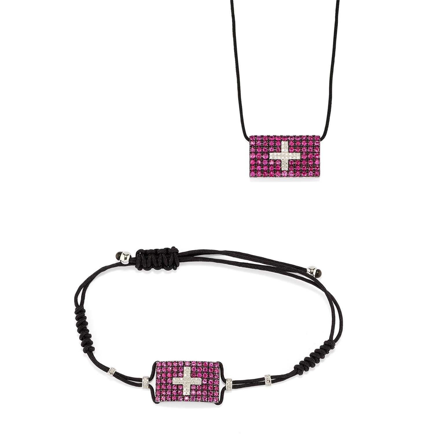 in oro bianco 18K con cordoncino nero con chiusura scorrevole che trattiene pendente di forma rettangolare con pavé di rubini per totale ct 3,00 circa e diamanti per totale ct 0,20 circa, composto da collana e bracciale, raffigurante bandiera svizzera.