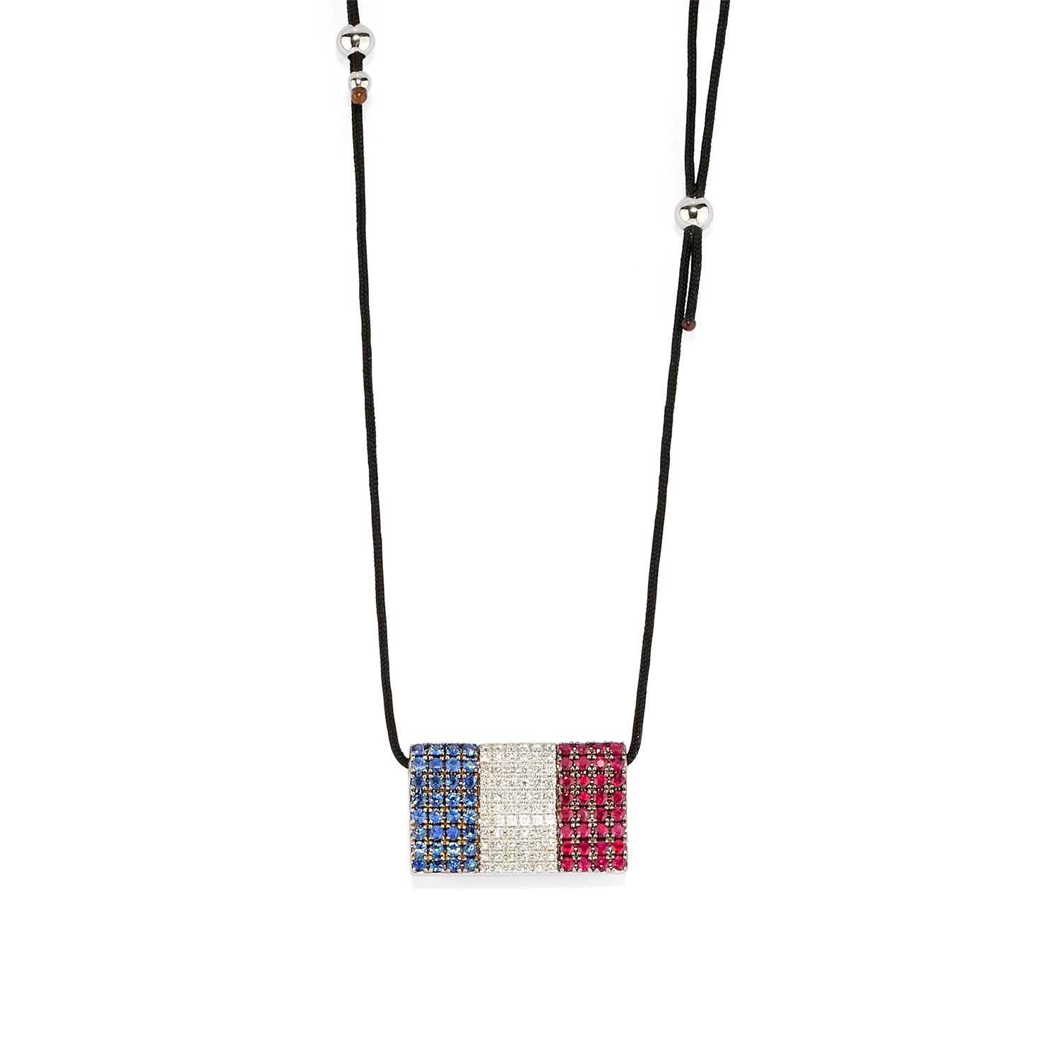 in oro bianco 18K e cordoncino nero con chiusura scorrevole che trattiene pendente di forma rettangolare con pavé di diamanti per totale ct 0,40 circa, zaffiri per totale ct 0,60 circa, rubini per totale ct 0,70 circa, raffigurante bandiera francese.