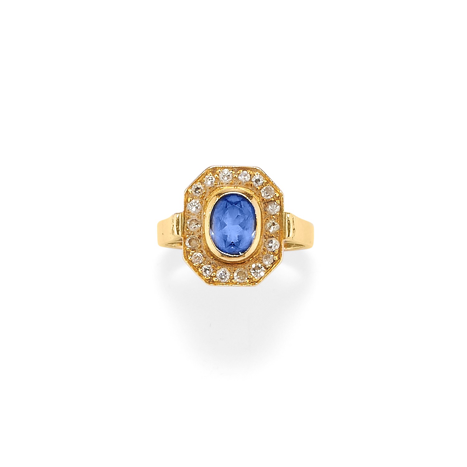 in oro giallo 18K, al centro zaffiro taglio ovale di ct 0,80 circa e diamanti.