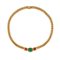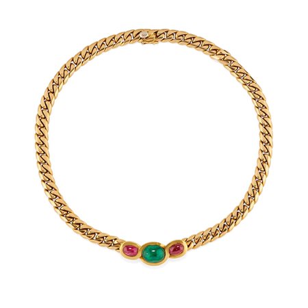 in oro giallo 18K, al centro smeraldo taglio ovale cabochon di ct 8,00 circa, ai lati due rubini taglio ovale cabochon per totale ct 4,50 circa, a maglia groumette.
