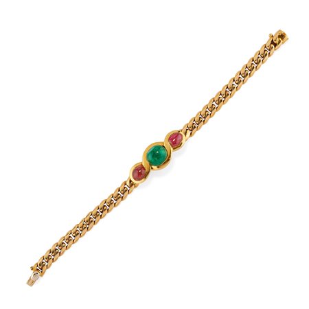 in oro giallo 18K, al centro smeraldo taglio ovale cabochon di ct 7,00 circa, ai lati due rubini taglio ovale cabochon per totale ct 4,00 circa.