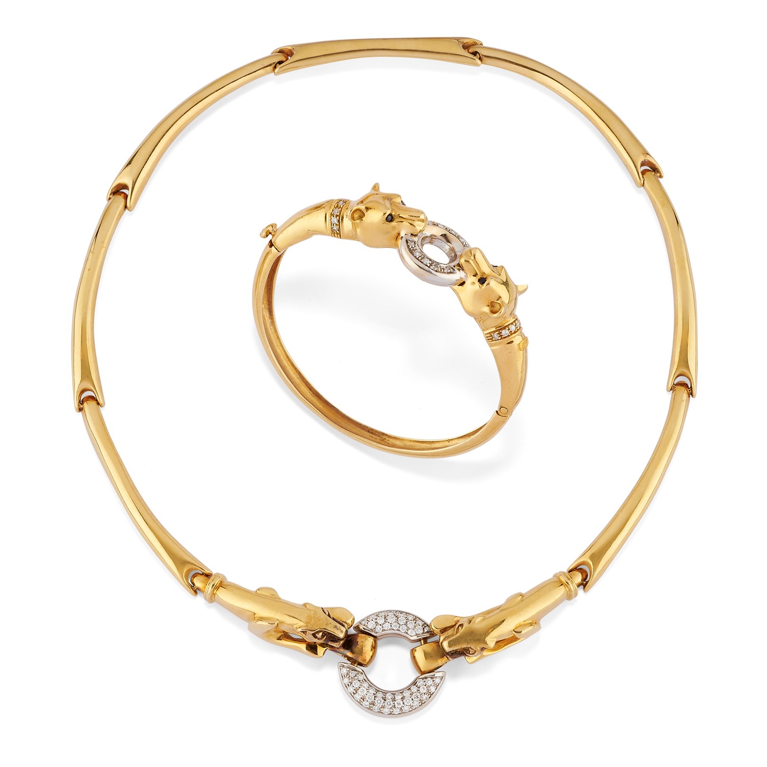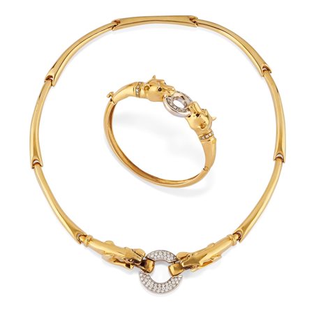 in oro giallo 18K, con motivo a pantere che trattengono disco in pavé di diamanti taglio brillante, composta da collana e bracciale.
