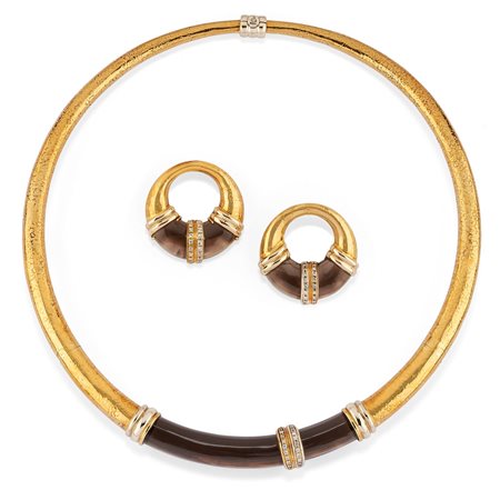 in oro giallo 18K, diamanti e quarzo fumé, composta da collana girocollo semi rigido, orecchini a cerchio, chiusura con perno e farfalla, con astuccio Mancadori la Squadra.