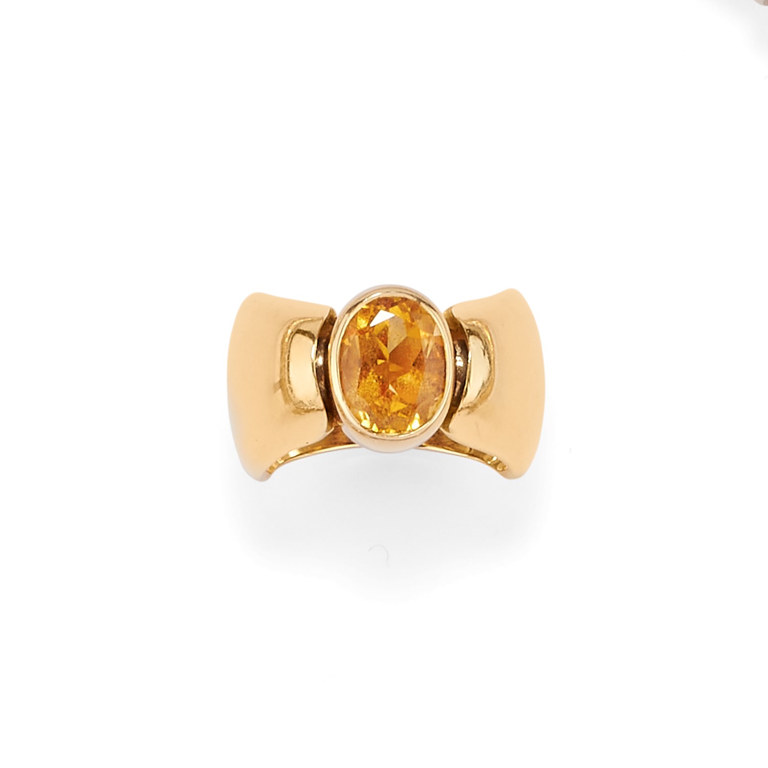 in oro giallo 18K, quarzo citrino taglio ovale entro castone basculante, Attr. Giò Caroli.