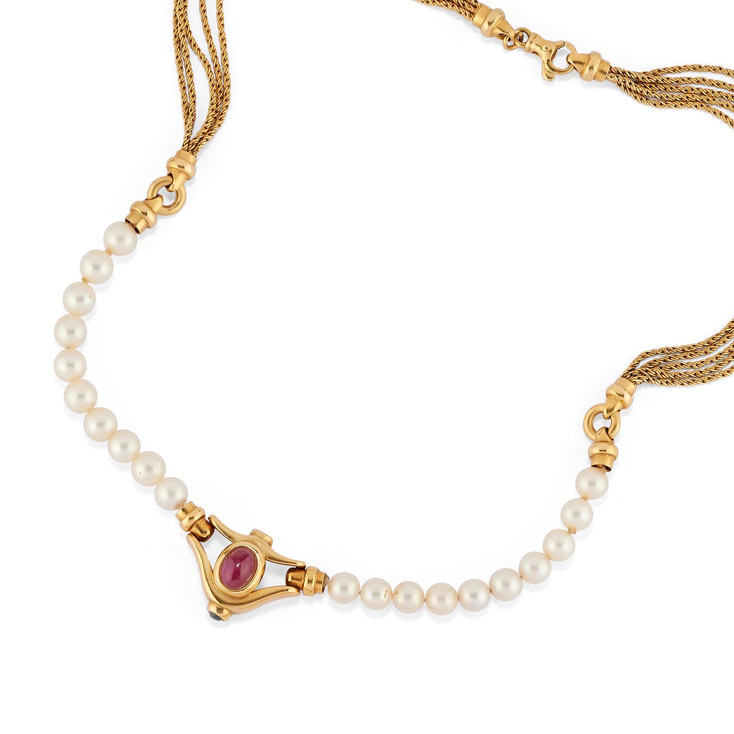 in oro giallo 18K, perle coltivate di mm 6,50, rubino taglio ovale cabochon e zaffiri (uno mancante).