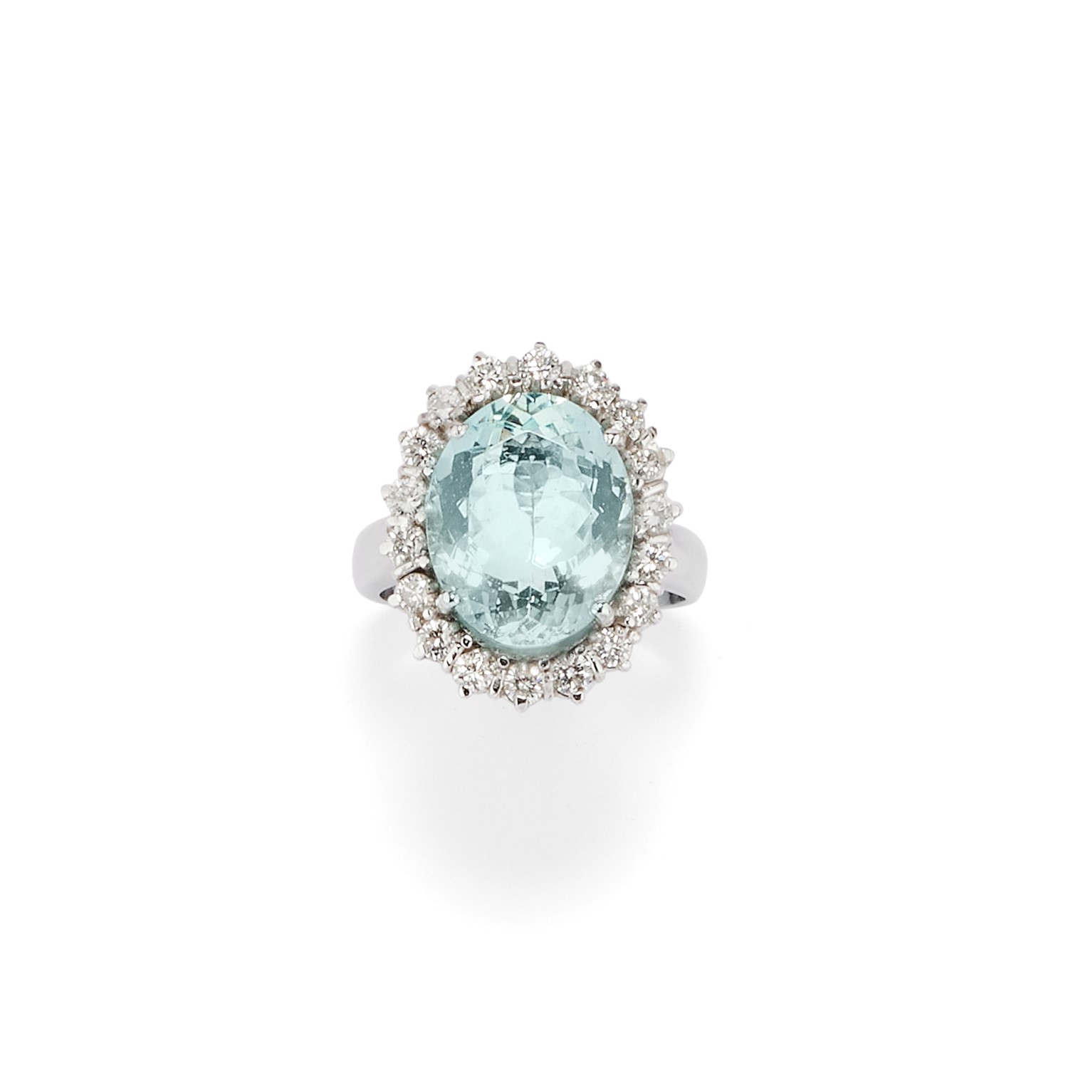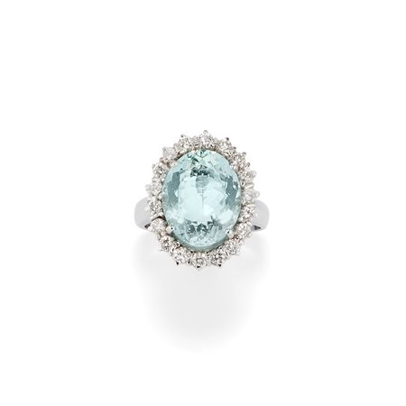 in oro bianco 18K e acquamarina taglio ovale di ct 7,20 entro cornice in diamanti taglio brillante per totale ct 0,80 circa.
