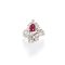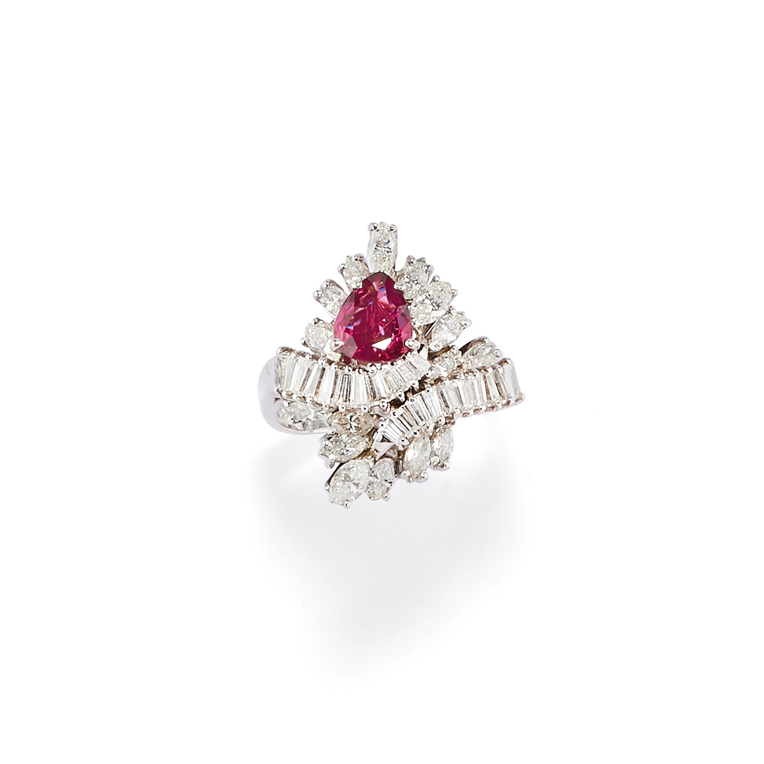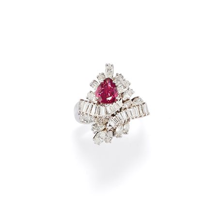 in oro bianco 18K, rubino taglio goccia di ct 0,50 circa, diamanti taglio navette e tapered baguette per totale ct 2,20 circa.