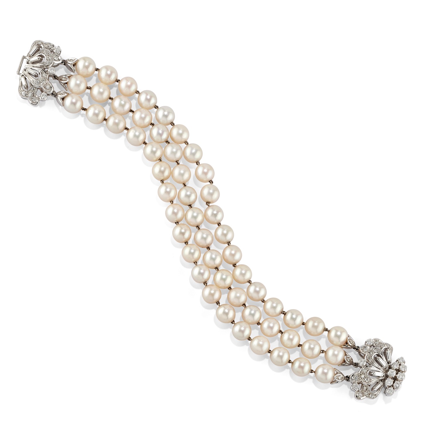 in oro bianco 18K, realizzato a tre fili di perle coltivate di mm 7,00 circa con chiusura a fiocco in diamanti taglio brillante, huit-huit e baguette per totale ct 2,00 circa.