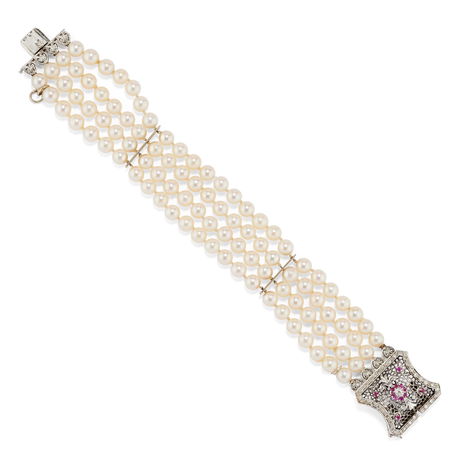 in oro bianco 18K, realizzato a quattro fili di perle coltivate di mm 6,00/6,50, rubini taglio rotondo e diamanti taglio huit-huit a decoro della chiusura.