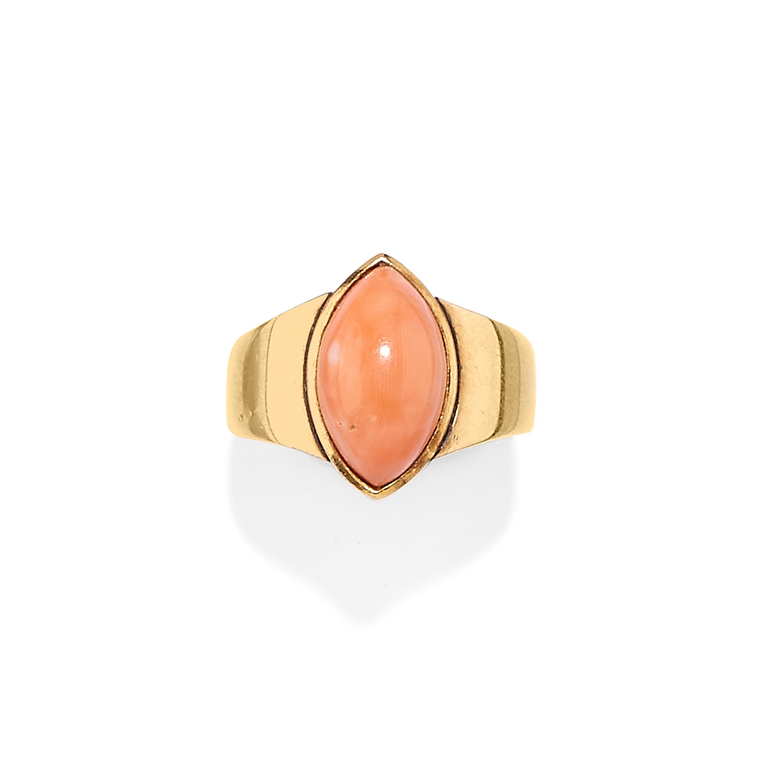 in oro giallo 18K e corallo taglio goccia cabochon.