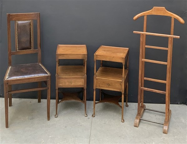 Lotto composto da una coppia di comodini a due ripiani con cassetto e pianetto alla base, montanti a colonnine (cm 30x65x30) uniti ad un servomuto ed una sedia (difetti)