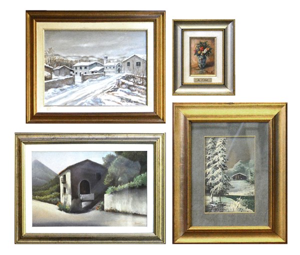 Lot 237 | Autori vari. Lotto di quattro dipinti ad olio raffiguranti "Paesaggi" e "Fiori"