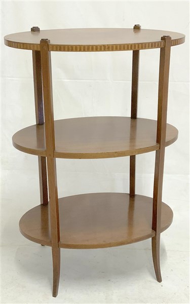 Lot 238 | Gueridon in mogano filettato a tre ripiani, montanti squadrati (51x76x32) (dife