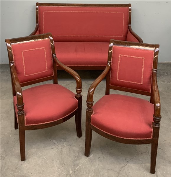 Fornitura da salotto in mogano composta da divano (cm 146x100x57) e due poltrone (cm 57x88x52) con sedute e schienali in tessuto rosso, secolo XIX (difetti)