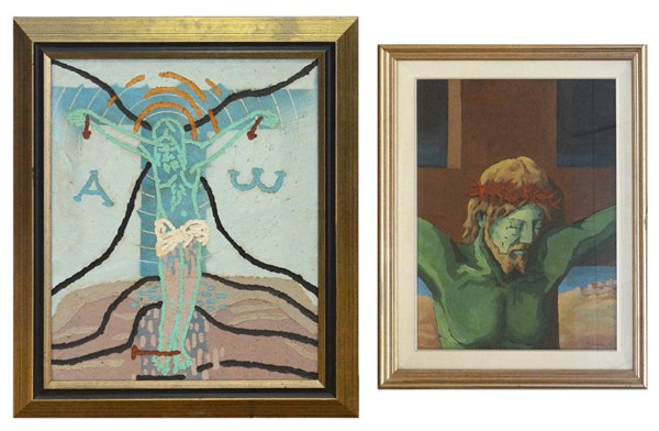 Lotto composto da due dipinti a tecnica mista su tela e su cartone telato raffiguranti Cristo Crocifisso, di autori e misure diverse. In cornici