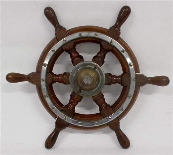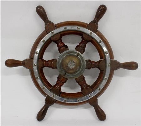Piccolo timone in legno e metallo marcato Laurence Simpson (d. cm 40) (difetti)