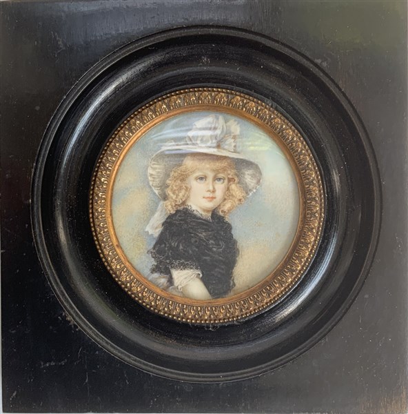 Firma indecifrata "Ritratto di fanciulla con cappello" miniatura tonda (d. cm 7
